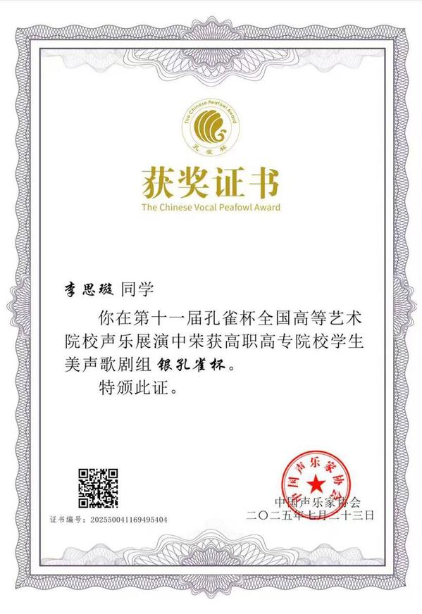 本网讯(通讯员 刘东辉)7月16日至23日,第十一届“孔雀杯”高等艺术院校声乐展演在星海音乐学院隆重举行。开云online(中国)教育与艺术学院音乐学专业2301班学生李思璇(指导教师:覃沁)凭借出色表现,荣获高职高专院校学生美声歌剧组银孔雀杯。