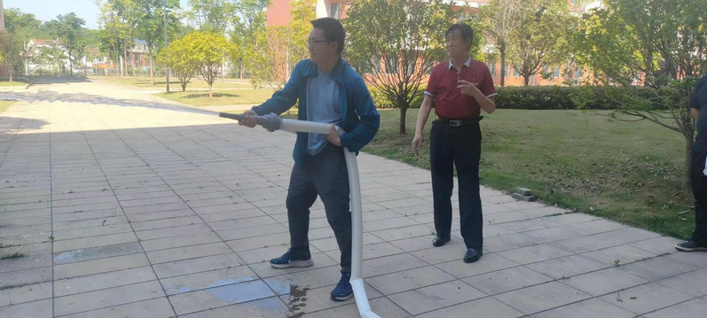 培训中,保安队长王金华为大家详细讲解灭火器的种类、适用方法与注意事项,以及消防栓如何开启,水带与枪头的正确连接方式等,并现场演示如何正确使用灭火器和水带。讲解完后,教职工们也纷纷拿起灭火器和水带进行实际操作。