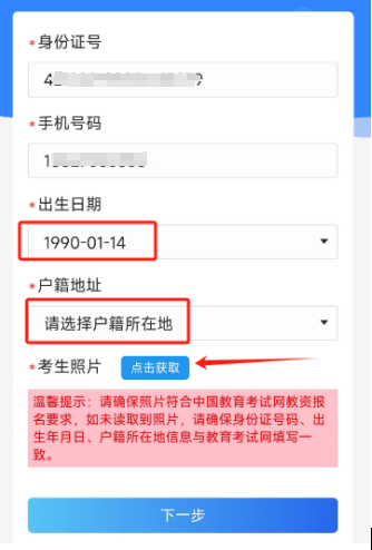 5.选择出生日期和户籍,然后“点击获取”检查考生照片。(请务必确保出生日期和户籍选择和中国教育考试网填写一致,请仔细核对保存一致)