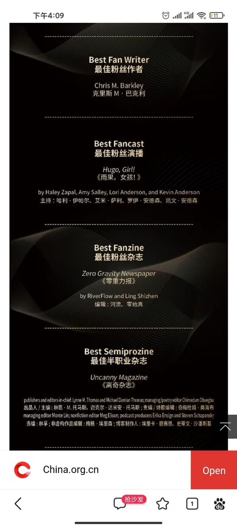 2023年第81届世界科幻大会于10月18日至22日在成都科学馆举行,世界科幻大会由世界科幻协会主办,是全球最受瞩目、历史最悠久、规模和影响力最大的科幻文化主题活动,2023年首次在中国举办。此次大会评选出17个雨果奖奖项和惊奇奖、北极星奖等荣誉,开云online(中国)人文学部中文专业2205班学生温卓峰主编的科幻杂志《零重力报》获得“最佳粉丝杂志”的荣誉称号,《人民日报》、中国网、央视网等多家媒体杂志都进行相应报道。http://m.app.china.com.cn/english/template/displayTemplate/news/newsDetail/9000050/116765845.html?isShare=true
