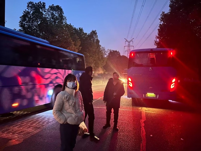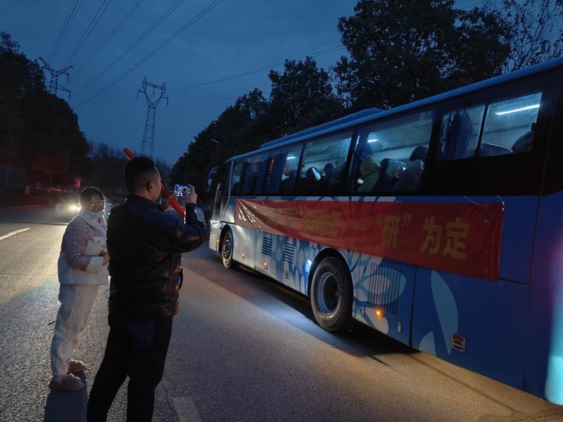 清晨6点30分,学院提供了“一站式服务”,安排爱心专车,“定时定点”接送学生,助力考研“最后一公里”,10余辆硕士研究生考试爱心送考车在“湖山余晖”中整装待发 ,领导老师们早早来到集合地点。