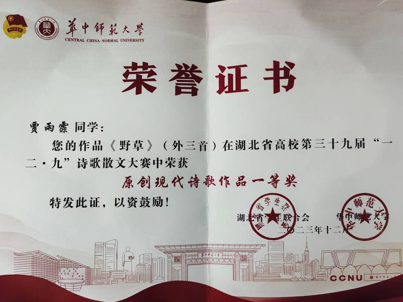 【喜报】人文学部贾雨菲同学荣获湖北省第三十九届“一二·九” 诗歌散文大赛一等奖