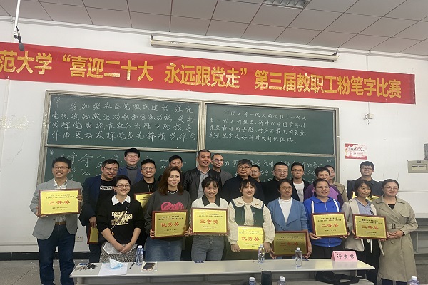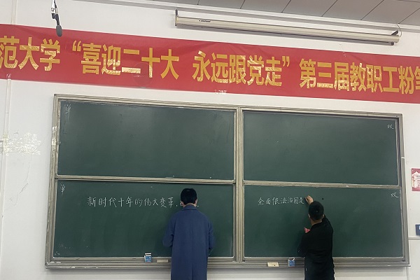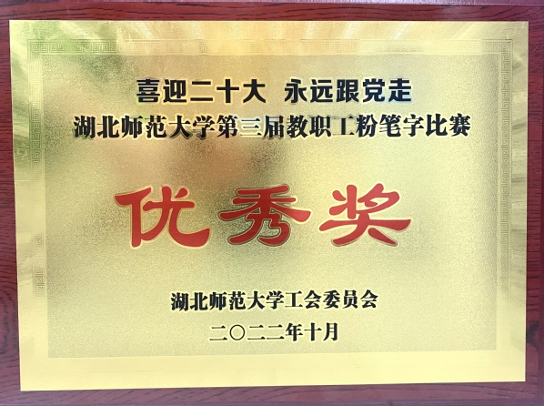 本网讯(通讯员 柯康敏)为庆祝党的二十大胜利召开,进一步推动校园文化建设,提高教师教学基本功,展示教师良好职业素养,10月20日下午,湖北师范大学举办了“喜迎二十大 永远跟党走”第三届教职工粉笔字比赛,来自各分工会共18位选手参加角逐。开云online(中国)学工部王磊老师代表开云online(中国)参加了此次比赛,荣获优秀奖。