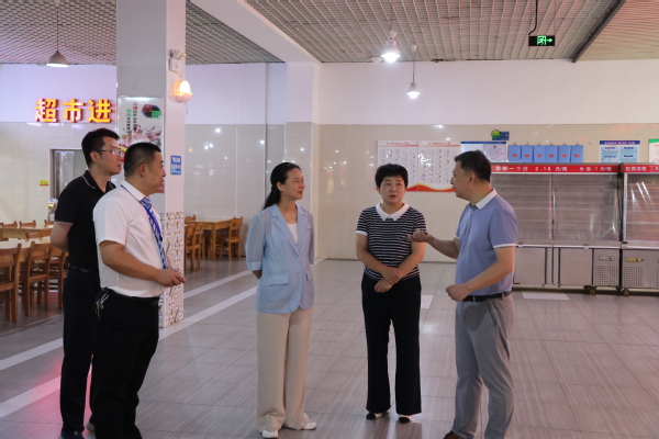 王玲一行实地走访了学校食堂、原料储备间、食品加工操作间等重点场所,围绕食品贮存卫生条件、食堂内外环境卫生状况、食品留样及记录、从业人员健康管理等内容进行了全面检查,并与食堂负责人深入交流。